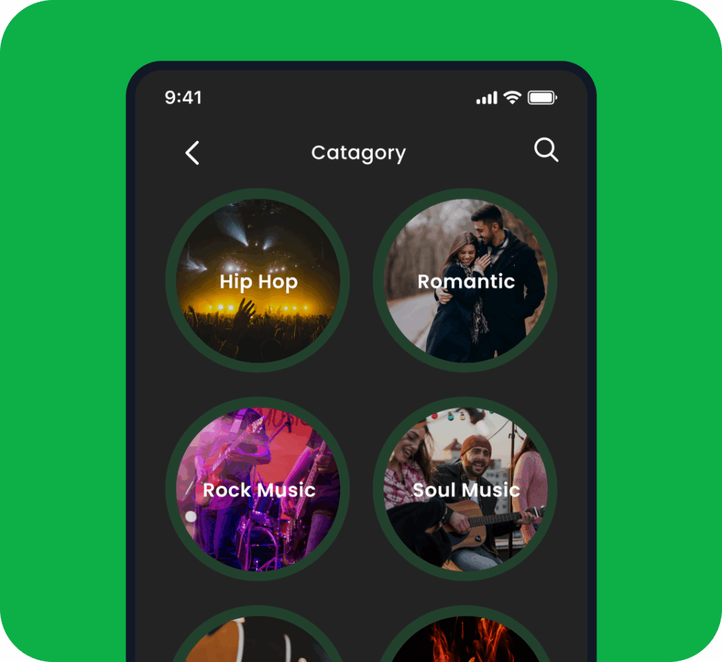 Our category-based discovery interface transforms how users connect with sound. From energetic Hip Hop to soulful ballads, every genre is visually defined, instantly accessible, and built for immersive exploration.